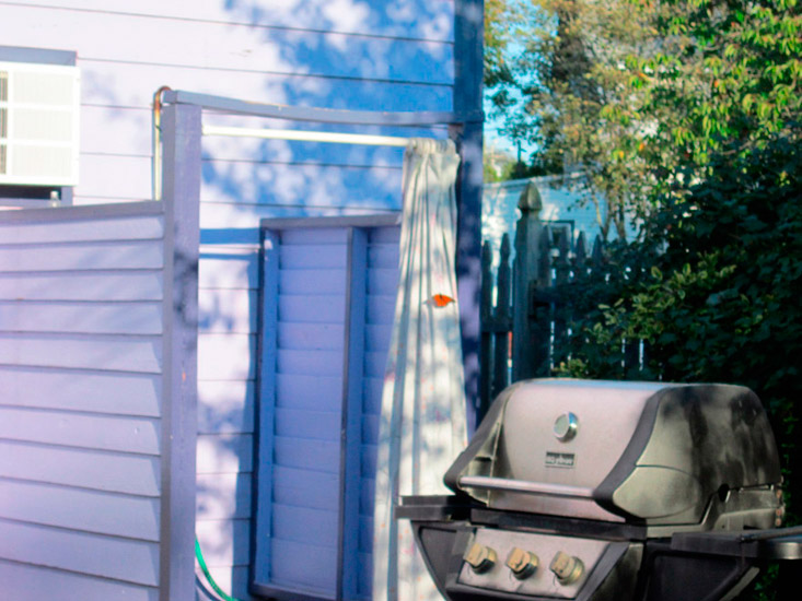 Do you see the outdoor shower curtain? A monarch is resting there… Incidentally, the shower curtain has a butterfly design on it.