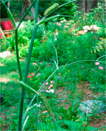 I am an avid butterfly gardener. I cannot kill caterpillars (cats) and like nothing more than when my milkweed (asclepias) plants do not get the opportunity to bloom (because the monarch babies—the cats—are eating the milkweed as fast as it grows). I buy parsley, dill and fennel, just to have them in the garden for the swallowtails (there are two swallowtail cats below who are very happy).