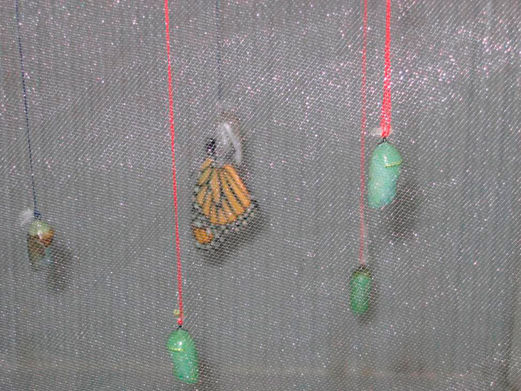 The following year I showed everyone, students and faculty alike, the monarch babies (cats were all over the milkweed we had planted). That year I simply had to have several impromptu seminars on raising monarchs; I passed around a leaf with a cat on it in my classes. Of course, after class I returned her to the garden.